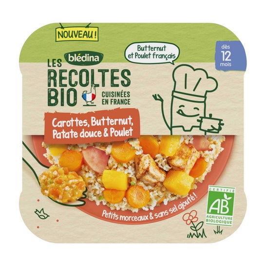 Leckeres Gericht für Babys ab 12 Monaten, mit dem die Kleinen auf gesunde und schmackhafte Weise neue Geschmacksrichtungen und Texturen entdecken können. Hergestellt aus Karotten, Kürbis, Bulgur, Huhn und anderen Gemüsesorten, die alle aus kontrolliert biologischem Anbau stammen und nach traditioneller Art im Werk in Brive-la-Gaillarde in Frankreich gekocht werden.