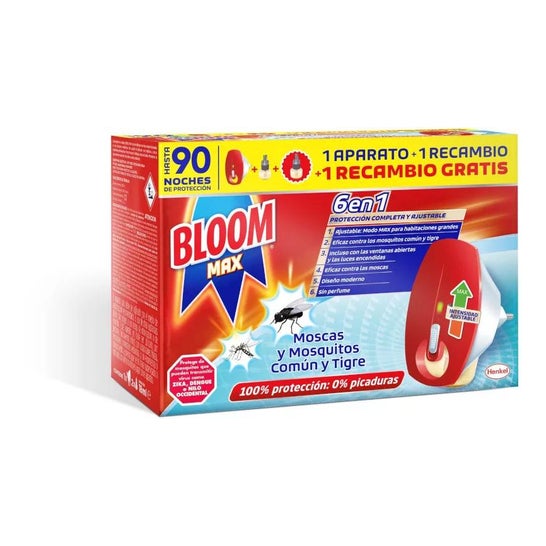 Bloom Pack Max Flies & Mosquitoes Device + 2 Nachfüllpacks ist ein elektrisches Insektizid, das hilft, Stechmücken zu beseitigen. Dank seiner Technologie ist es wirksam gegen die gemeine Mücke und die Tigermücke.