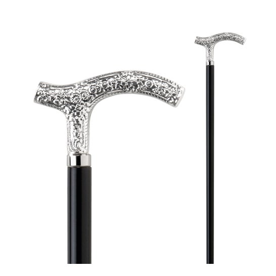 Stock mit einem Holzstab, der Menschen mit eingeschränkter Mobilität hilft. Sein verstellbares Format verfügt über einen silberbeschichteten Metallgriff, der dekoriert und graviert ist.