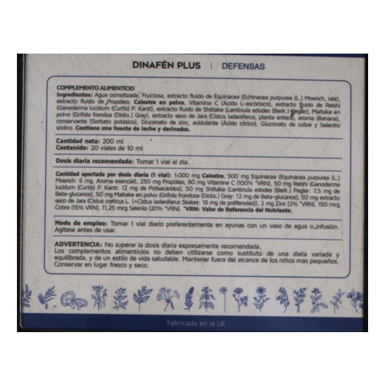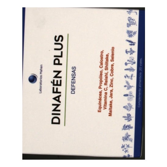 Dinafen Plus 20 Fläschchen ist ein Nahrungsergänzungsmittel in flüssiger Form, das dem Immunsystem hilft, richtig zu funktionieren. Mit Kolostrum, Echinacea, Zistrose, Propolis und Shiitake-, Reishi- und Maitake-Pilzen trägt es zur Stärkung der Abwehrkräfte bei