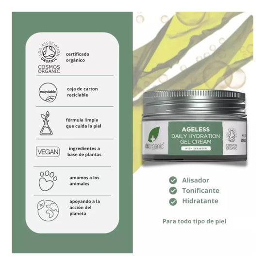 Dr. Organic Ageless Gel Creme Tag Algen 50ml ist eine innovative Gelcreme, die für die tägliche Hautpflege entwickelt wurde. Diese leichte und cremige Formel wirkt als Glättungsmittel und Toner, bietet optimale Feuchtigkeit und ein frisches Gefühl den ganzen Tag über.