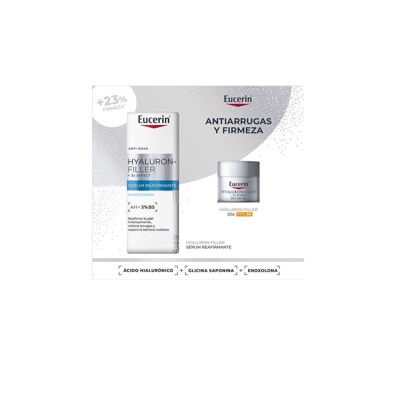 Eucerin Hyaluron-Filler Tag LSF 30 vervollständigt die tägliche Routine mit seiner Triple Effect Formel (x3), die: