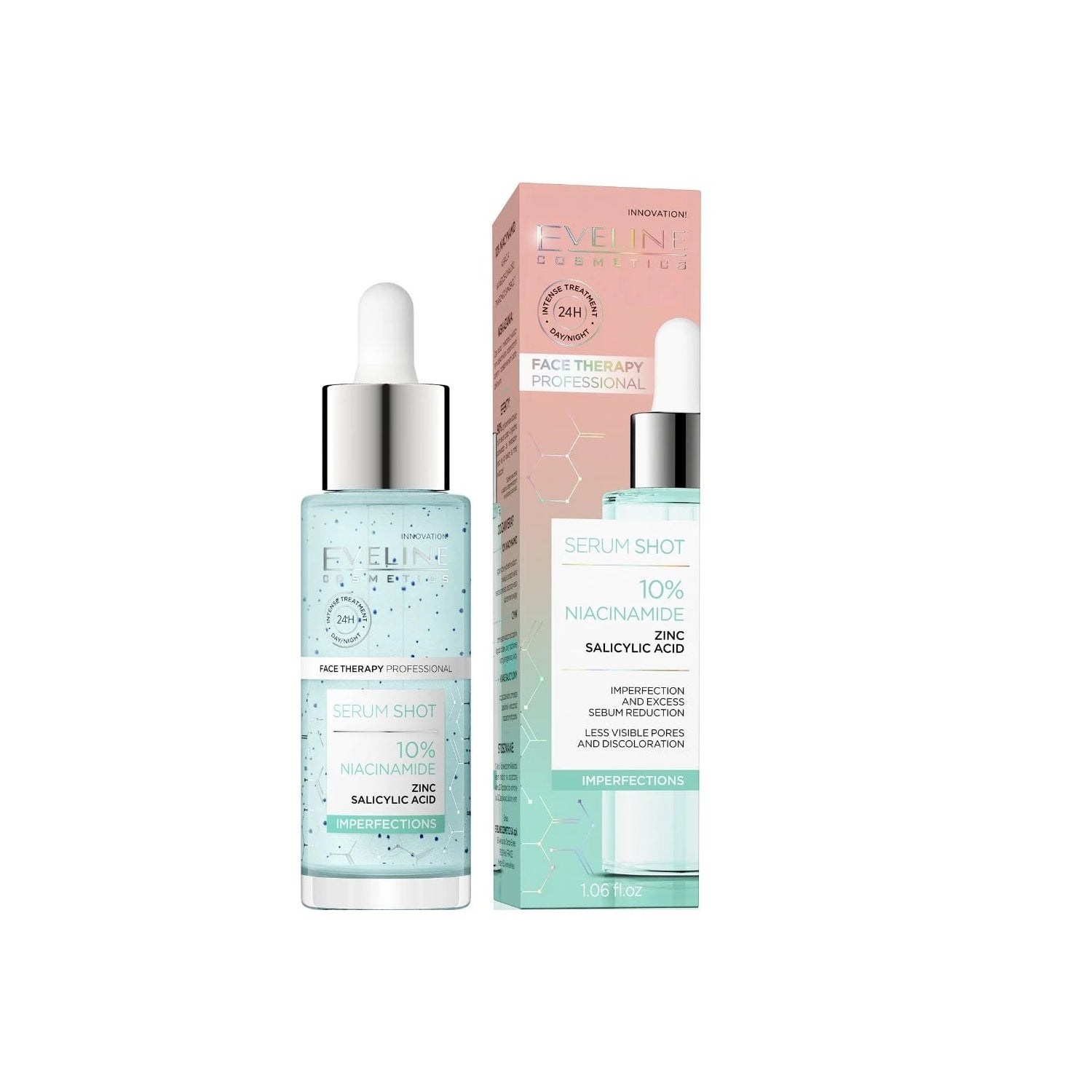 Eveline Cosmetics 10% Niacinamid Serum Shot 30ml ist ein speziell für fettige und problematische Haut formuliertes Serum. Der Gehalt an Niacinamid wirkt effektiv auf Akne-Läsionen und Hautunreinheiten.