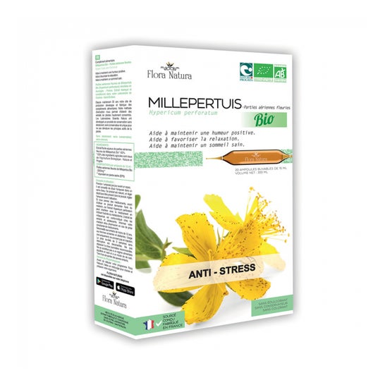 Johanniskraut in Ampullen aus kontrolliert biologischem Anbau. Seine Eigenschaften sind für eine gute geistige Gesundheit angezeigt. Sie entspannen den Geist und sorgen für Ruhe in Zeiten besonderer Not oder Stress. Sie tragen zu einer guten Schlafhygiene bei, fördern die Entspannung und bekämpfen Schlaflosigkeit. Sie verbessern Momente leichter persönlicher Krisen und postmenopausale Prozesse.