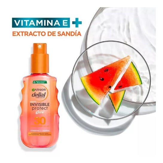Garnier Delial Invisible Protect Glow SPF30 150ml ist ein Sonnenschutzmittel für Gesicht und Körper, angereichert mit Vitamin E und Wassermelonenextrakt.