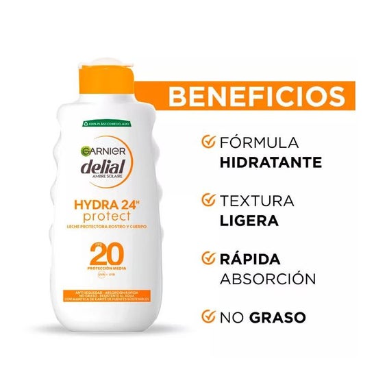 Garnier Delial Hydra 24h Protect Sunscreen Milk SPF20 200ml ist ein Sonnenschutzmittel für Gesicht und Körper, das die Haut dank seines Mexoryl® SX-Filters vor UVB-, UVB- und Infrarotstrahlen schützt.