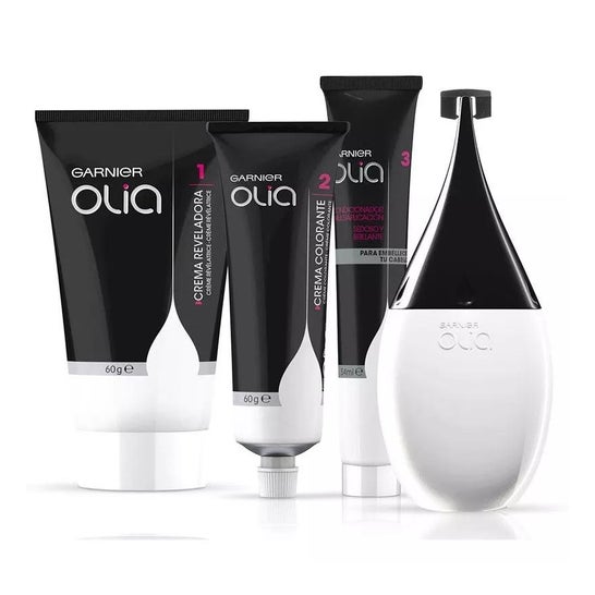 Das Set enthält eine Färbecreme, eine Entwicklercreme und eine Spülung sowie einen ergonomischen Applikator für eine präzise Anwendung. Die Olia-Haarfarbenlinie bietet eine breite Palette von bis zu 30 Farbtönen zur Auswahl.