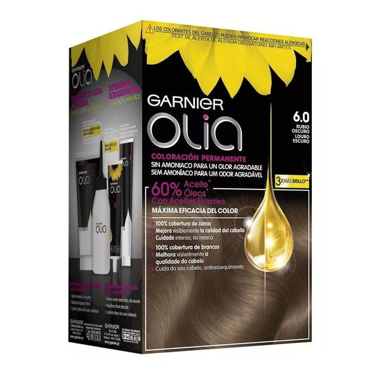 Garnier Olia Permanente Haarfarbe 6.0 Dunkelblond ist eine ammoniakfreie permanente Haarfarbe, die 100% der grauen Haare abdeckt und mit 60% natürlichen Ölen angereichert ist.