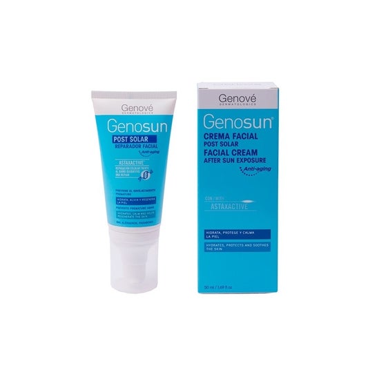 Genové Genosun Aftersun Facial Repairing Aftersun 50ml ist ein Aftersun, dasdie durch Sonneneinwirkung gereizte Haut mit Feuchtigkeit versorgt, beruhigt und regeneriert. Es enthält Anti-Aging-Wirkstoffe, die helfen, die Hautzellen nach oxidativen Schäden, die sie durch Sonneneinwirkung erlitten haben, zu reparieren.