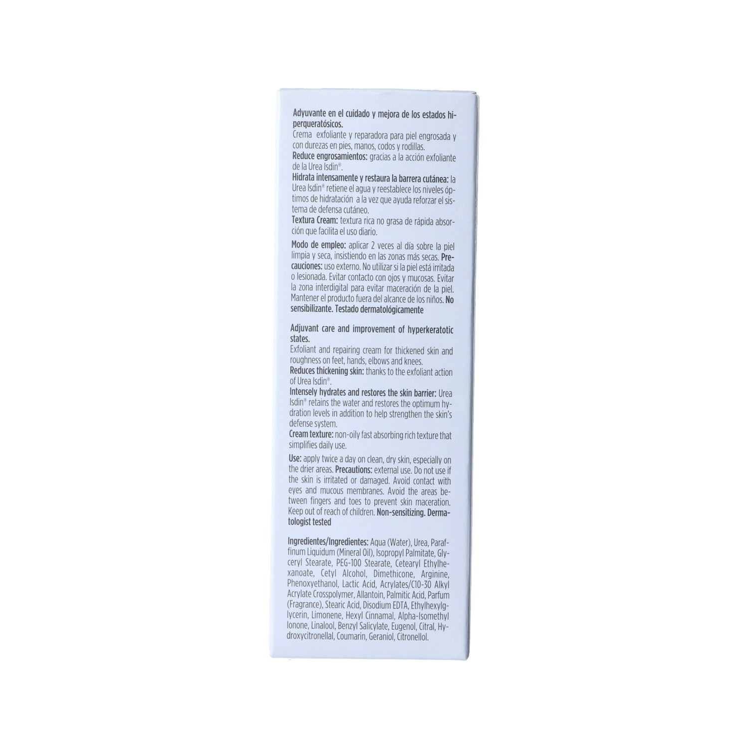Ihre Formel enthält 30% Urea Isdin, das eine feuchtigkeitsspendende und mikroexfolierende Wirkung hat und die Haut glättet und weicher macht. Ihre nicht fettende Textur, die schnell und leicht einzieht , ist ideal für die Befeuchtung der schwierigsten und verdickten Haut, von den leichtesten bis zu den schwierigsten Fällen.