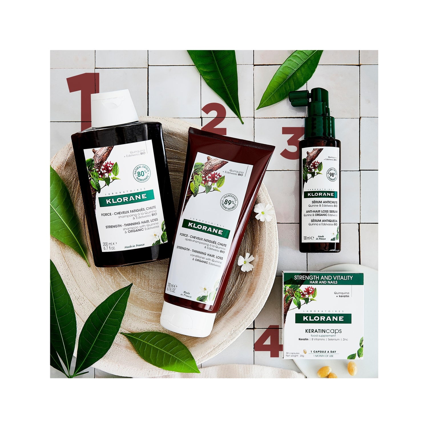Es besteht aus einer aktiven Kombination von Vitamin B und Chinin, die dafür sorgt, dass das Haar seine Festigkeit und sein Volumen zurückgewinnt. Chinin ist bekannt für seine astringierenden und stärkenden Eigenschaften, die im Inneren der Haarzwiebel wirken und das Haar von der Wurzel an stärken und mehr Volumen verleihen.