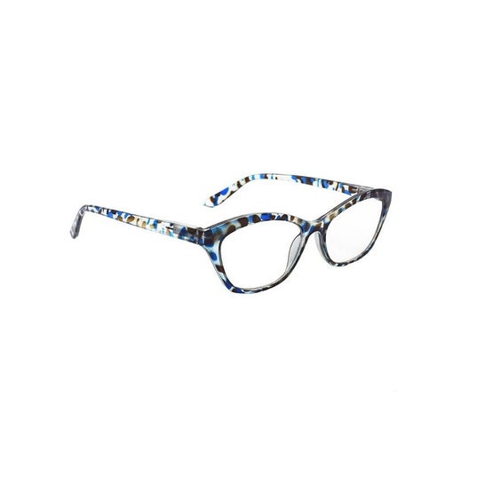 Lesebrille für Frauen mit vorgefertigten Gläsern und einem gemusterten Fleckendesign in Braun- und Blautönen. Das kompakte Design ist sehr robust und bequem dank des Rahmen aus Polycarbonat. Die ovale Form passt zu fast jedem Gesichtstyp. Diese Brille ist perfekt für Alterssichtigkeit. Mit einer Dioptrienzahl von 2.