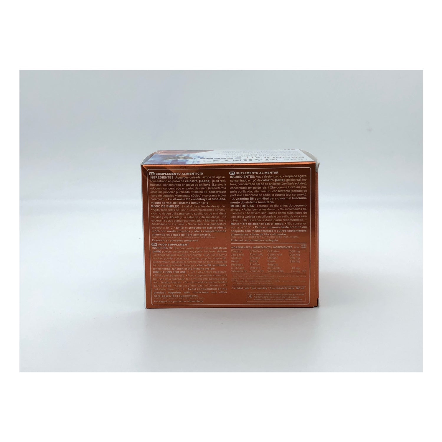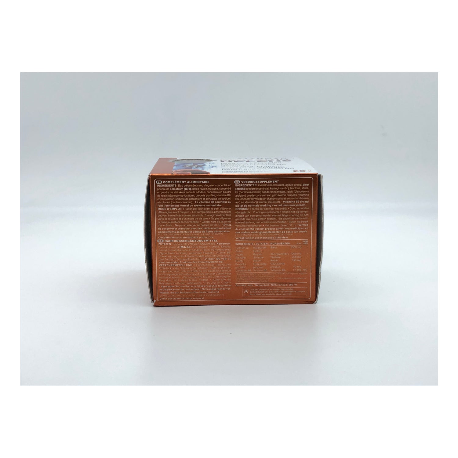 Es besteht aus Kolostrum, Gelée Royale, Propolis, Reishi, Shiitake und Vitamin B6 und ist in praktischen Trinkfläschchen erhältlich.