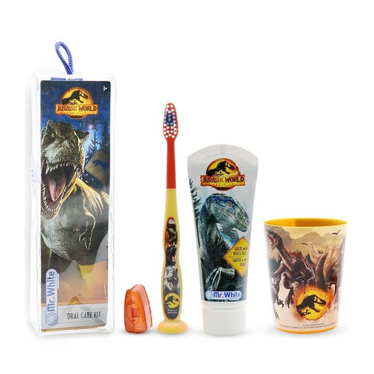 Mr. White Jurassic World Kit Zahnbürste + Zahnpasta + Becher ist ein Set, das speziell entwickelt wurde, um die Zahnhygiene der Kleinsten unterhaltsamer zu gestalten. Dieses Kit enthält: