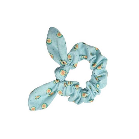 Kleiner Haargummi in hellblau mit einem Schleifen-Design und Avocado-Muster. Er ist für alle Altersgruppen geeignet und trägt dazu bei, einen Frisurenlook zu kreieren.