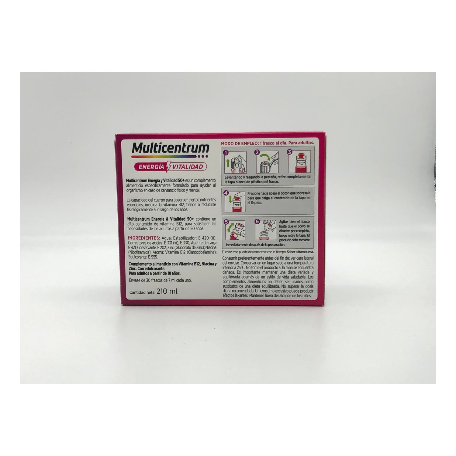 Dieses Ergänzungsmittel wird in einem innovativen, trinkfertigen Format mit einem angenehmen Himbeergeschmack angeboten, was den Verzehr erleichtert, insbesondere für diejenigen, die Schwierigkeiten haben, Tabletten zu schlucken. Die Flüssigkeit hat eine rosa Farbe aufgrund des Vorhandenseins von Vitamin B12, das mit der Zeit verblassen kann.