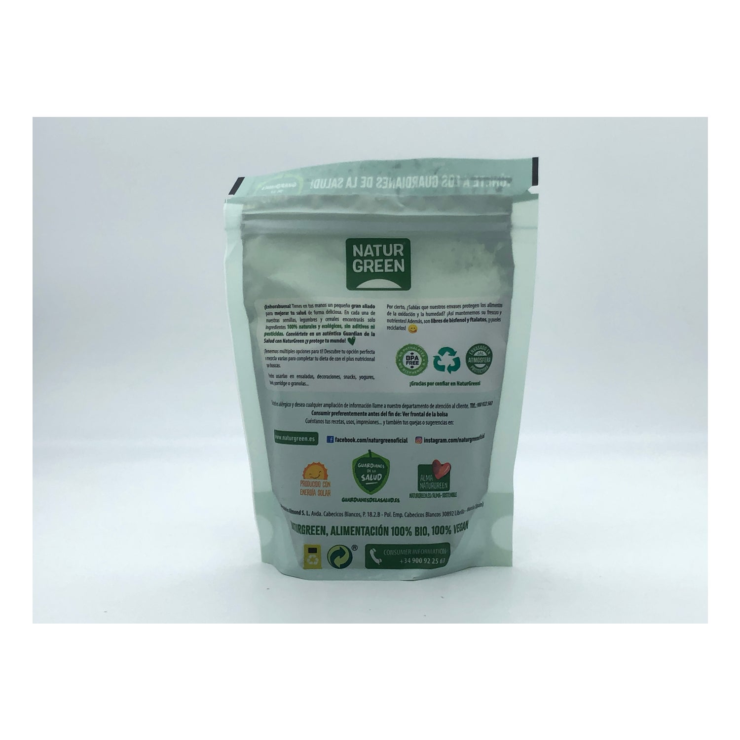 Spirulina von Naturgreen, 175 Gramm. Spirulina ist eine mikroskopisch kleine Alge mit einer Form, die einer Spirale sehr ähnlich ist, was der Ursprung ihres Namens ist. Sie hat blaue und grünliche Farbtöne aufgrund ihres Reichtums an Phycocyanin und Chlorophyll. Sie wurde von der UNESCO als Nahrungsmittel des Jahrtausends erklärt. Sie enthält 55 % Protein sowie verschiedene Arten von Vitaminen und Mineralien in unterschiedlichen Anteilen. Ihre Eigenschaften sind für den menschlichen Körper notwendig. Sie ist reich an Eisen, Zink, Ballaststoffen, Vitamin B1, B2 und B3. Sie wird ökologisch, vegan und glutenfrei hergestellt. Sie ist für jede Person geeignet, die ihrer Ernährung ein gesundes Lebensmittel hinzufügen möchte, das ihr Energie und Proteine liefert. Bei gesundheitlichen Problemen, die mit ihrer Verwendung unvereinbar sind, oder bei Zweifeln, konsultieren Sie bitte Ihren Hausarzt.