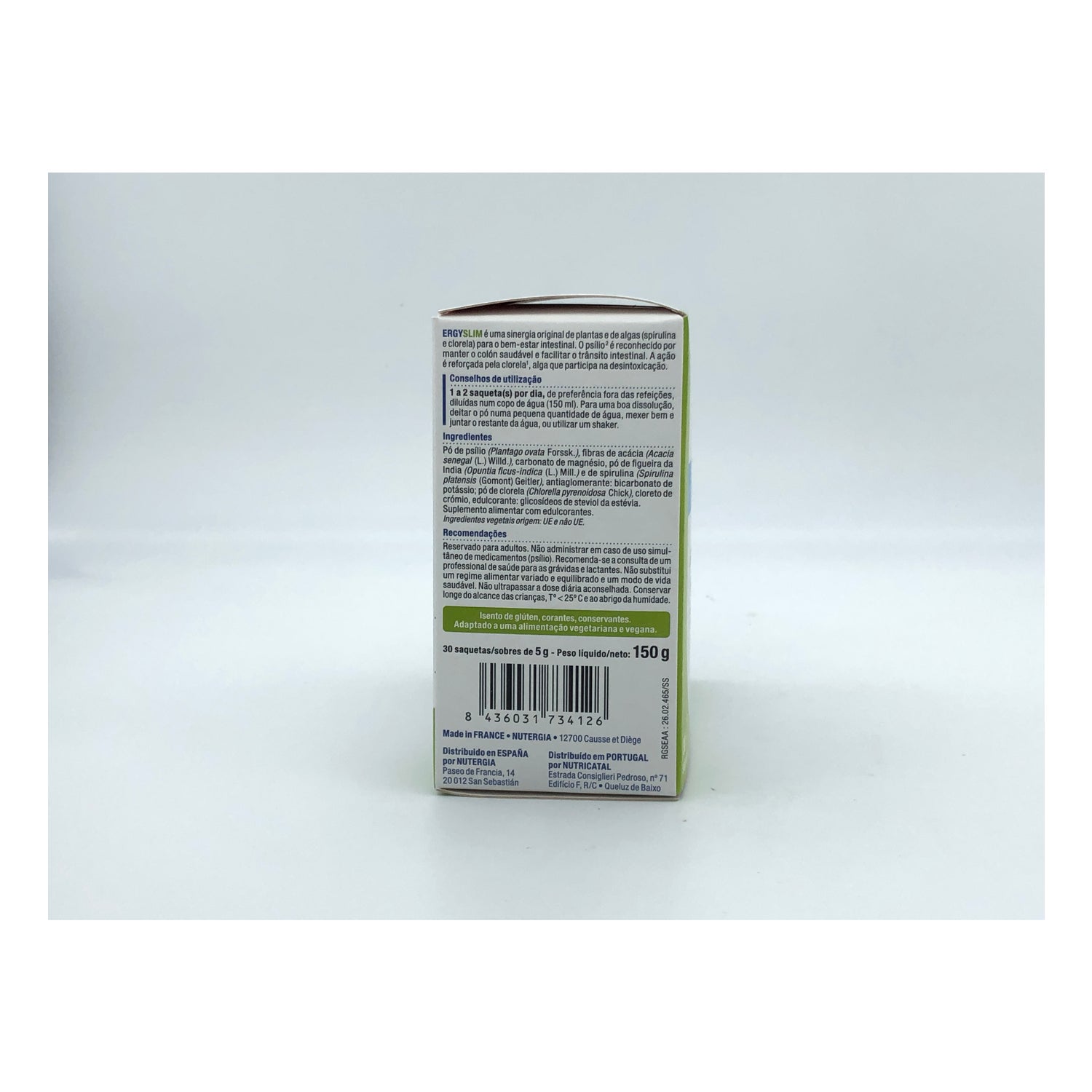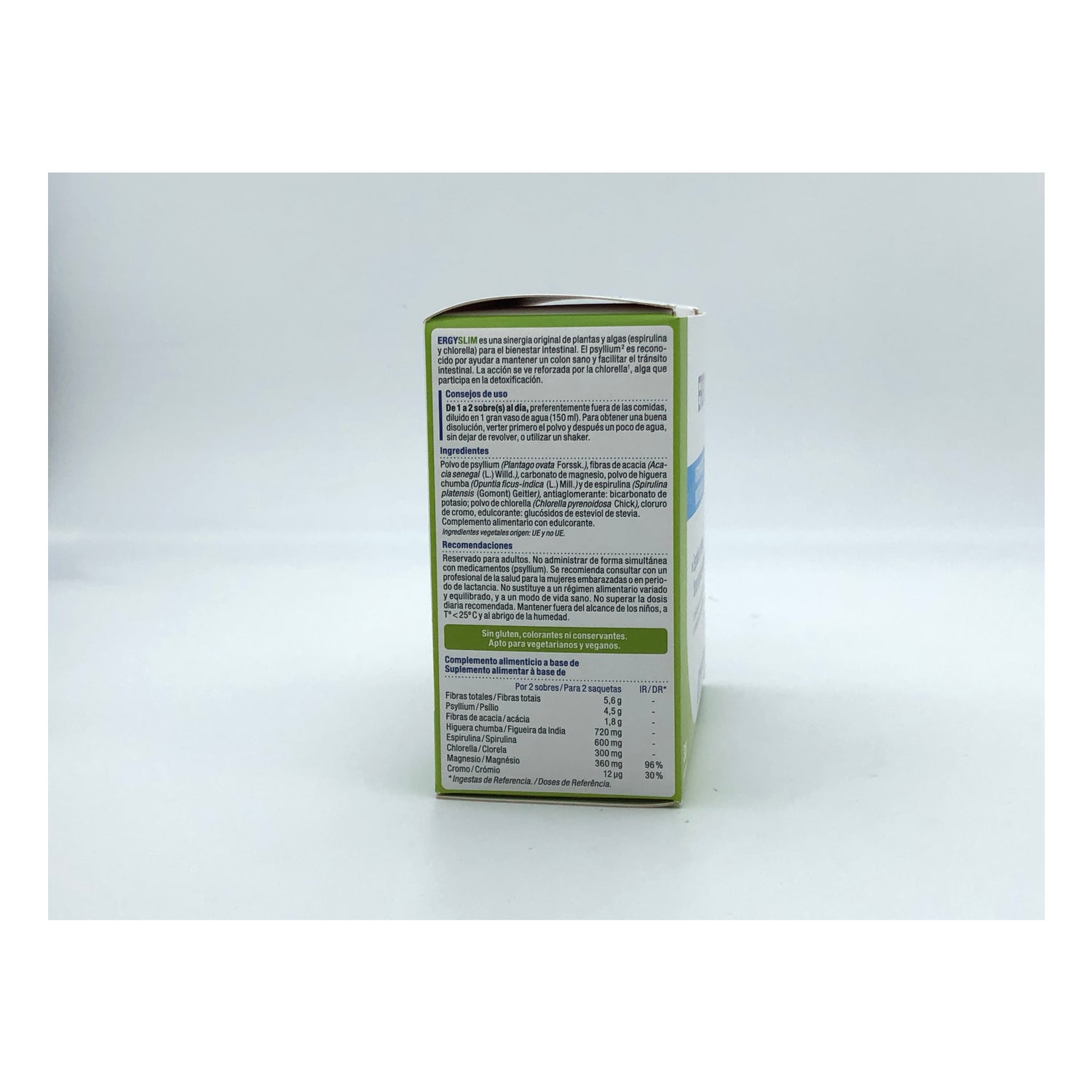 Pulver aus Plantago ovata (Psyllium) 2,5g, Fasern aus Akazie des Senegals 1g, Pulver aus Opuntia ficus indica (Nopal) 400mg, Extrakt aus Garcinia cambogia (mit 150 mg. Hca) 250mg, Chrom (Chlorid) 10mcg, Gesamtfasern 1,79g.