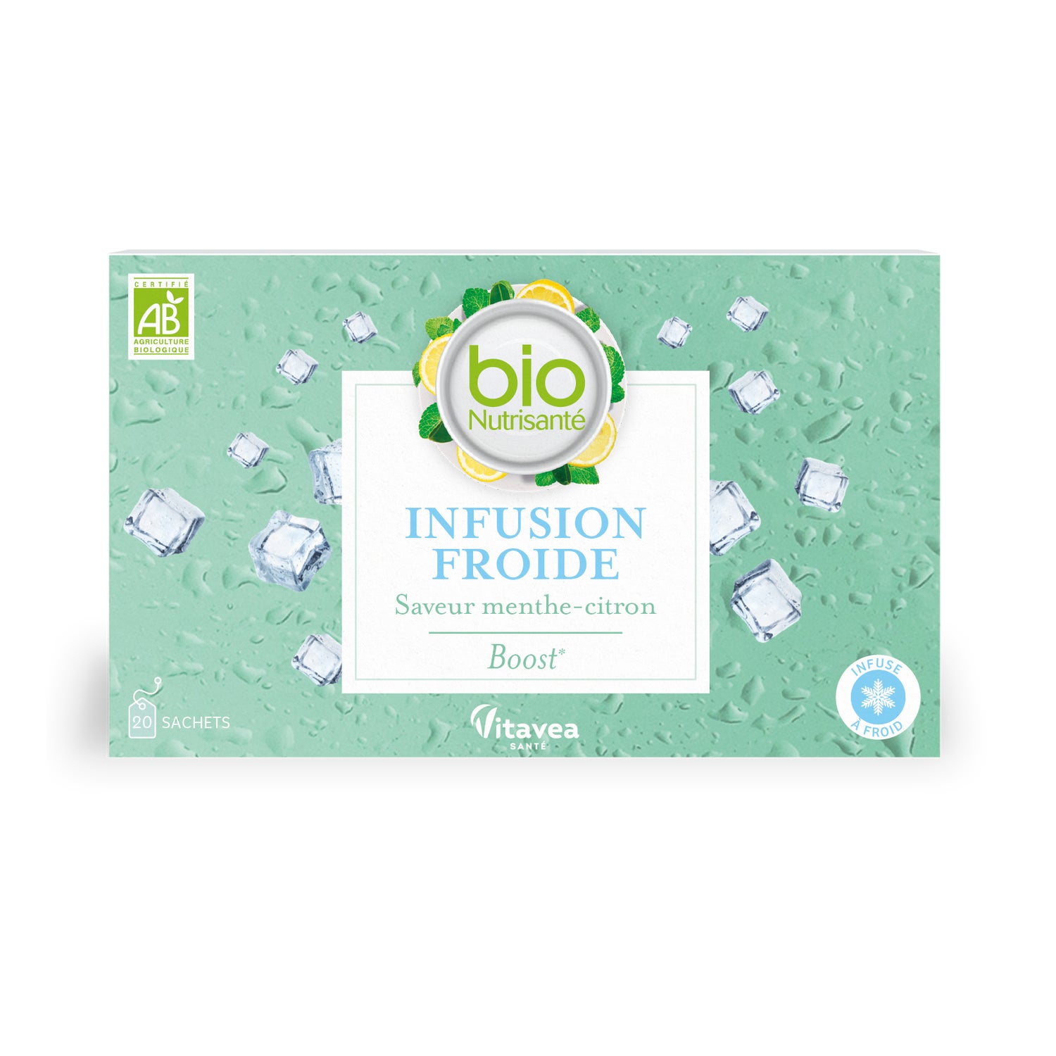 Nutrisanté Infusion Kalt Boost Bio 20 Beutel ist eine aromatisierte Zubereitung für eine Pflanzeninfusion, die darauf abzielt, einen Energie-Kick zu liefern.