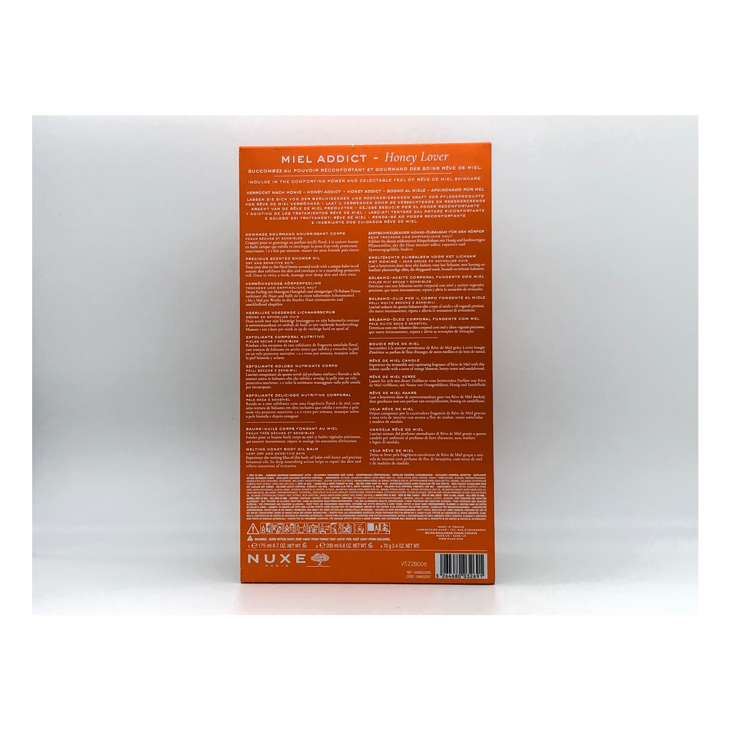 Diese Packung enthält ein Peeling, das die Haut nährt und peelt, Rêve de Miel Nourishing Body Scrub 175 ml, eine Körpercreme, die die Haut beruhigt und schützt, Rêve de Miel Honey Balm-Melting Body Oil with Honey, und eine Raumkerze Rêve de Miel 70 g. Außerdem wird er in einem recycelbaren, plastikfreien Karton geliefert.