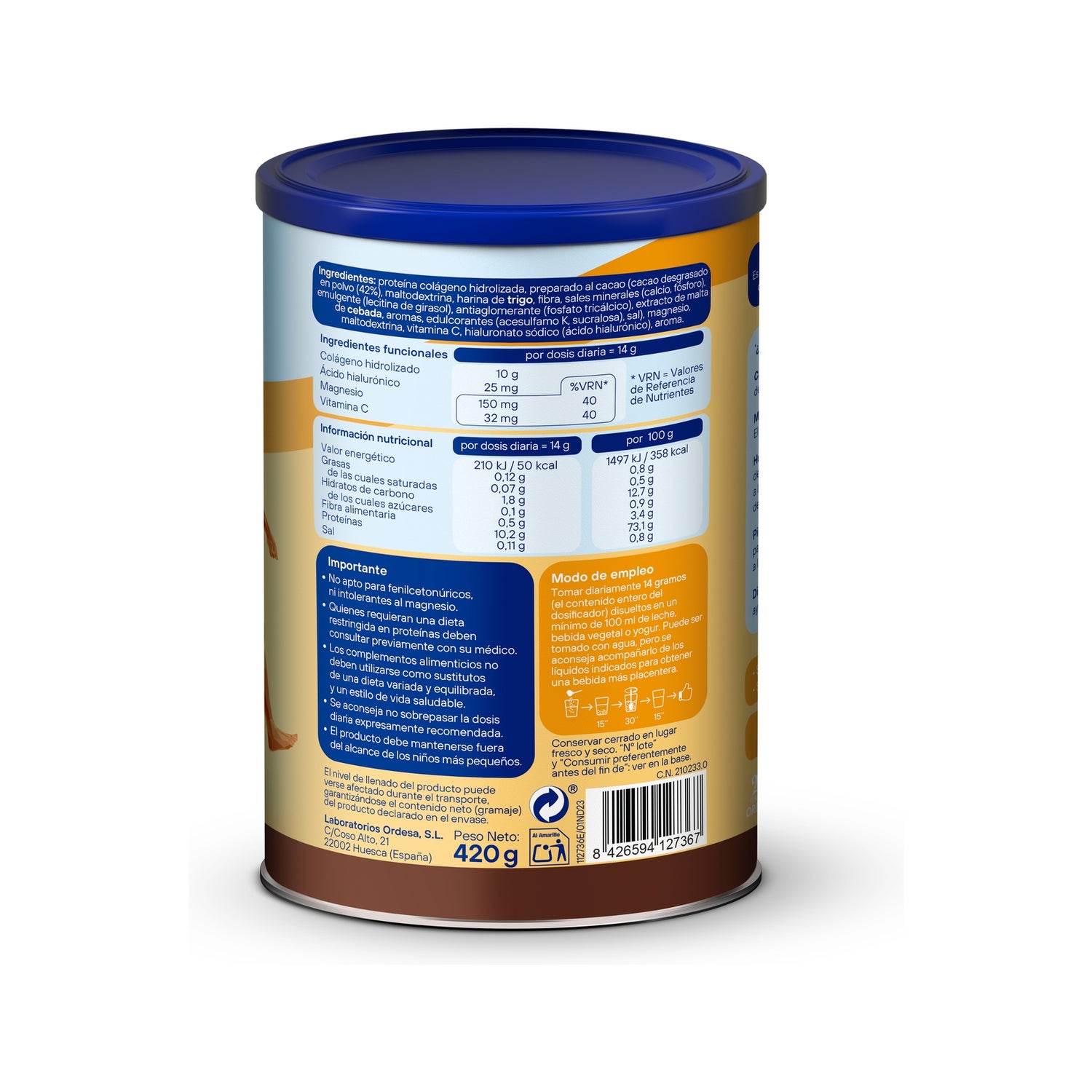 Es trägt zur normalen Erhaltung der Haut-, Knochen-, Gelenk- und Muskelgesundheit bei. Zudem ist es mit Magnesium, Vitamin C und Hyaluronsäure angereichert, Elemente, die helfen, oxidativem Stress entgegenzuwirken und Sehnen sowie Gelenke zu schützen.