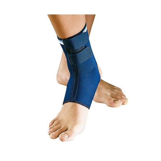 Offene Neopren-Knöchelstütze mit einer Dicke von 3 Millimetern, Größe 2 (24-26 cm). Die Öffnung in der oberen Mitte kann mit Klettverschlüssen angepasst werden, um die erforderliche Kompression zu regulieren und anzupassen, was eine notwendige Stabilisierungswirkung bei leichten Bänderdehnungen, Sehnenentzündungen sowie postoperativen und rehabilitativen Maßnahmen bietet. In blauer Farbe.