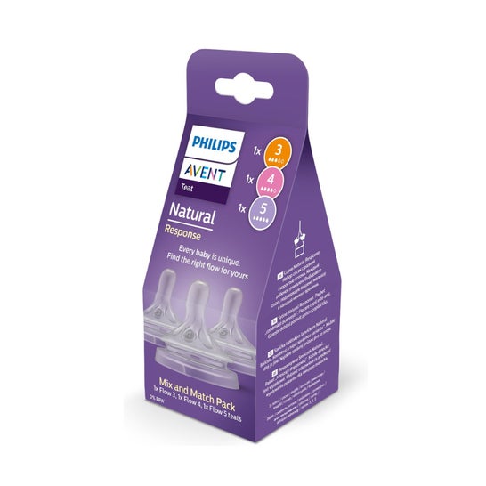 Philips Avent Pack Mix & Match Sauger Natural Response T3+T4+T5 ist ein Set von Silikonsaugern, die entwickelt wurden, um ein Fütterungserlebnis zu bieten, das dem natürlichen Rhythmus des Babys ähnelt. Dieses Set erleichtert den Übergang von der Stillzeit zur Flaschennahrung und passt sich den Wachstumsbedürfnissen des Kleinen an.