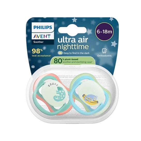 Philips Avent Ultra Air Nacht Camaleón Mono 6-18M 2 Stück ist ein Produkt, das entwickelt wurde, um außergewöhnlichen Komfort und Bequemlichkeit für Babys während der Nacht zu bieten. Dieses Modell des Schnullers ist für Kinder im Alter von 6 bis 18 Monaten geeignet und bietet eine praktische Lösung für diejenigen, die während des Schlafs zusätzliche Ruhe benötigen.