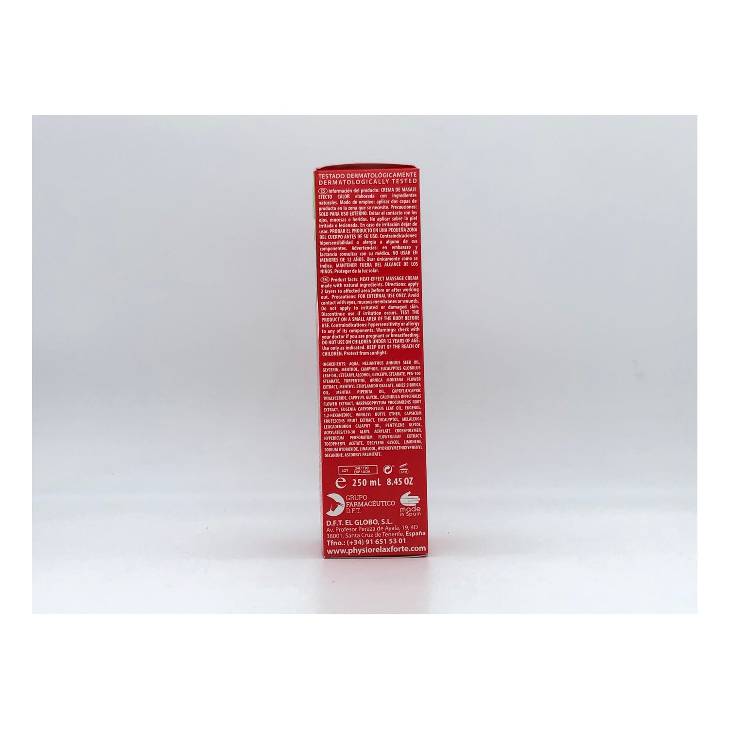 Körpercreme mit intensiver Wärmewirkung, die den Muskeln hilft, sich zu erholen und zu regenerieren. Hilft, Kontrakturen, Muskelkrämpfe und Gelenk- oder Bänderbeschwerden zu lindern. Mit einem Komplex aus ätherischen Ölen namens Helenalin2, der Arnika, Teufelskralle, Hypericum, Calendula und Helenalin mit wissenschaftlich nachgewiesenen entzündungshemmenden und heilenden Eigenschaften enthält. Angereichert mit Capsaicin, das wärmend wirkt. Es eignet sich zum Aufwärmen vor dem Sport und hilft bei Ermüdungserscheinungen, die durch die tägliche Arbeit verursacht werden, insbesondere im unteren Rücken- und Nackenbereich. Für alle Hauttypen geeignet.