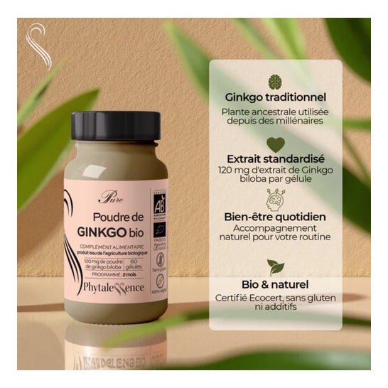Phytalessence Ginkgo Bio 60 Perlen ist ein Nahrungsergänzungsmittel auf Basis von Ginkgo biloba Extrakt.
