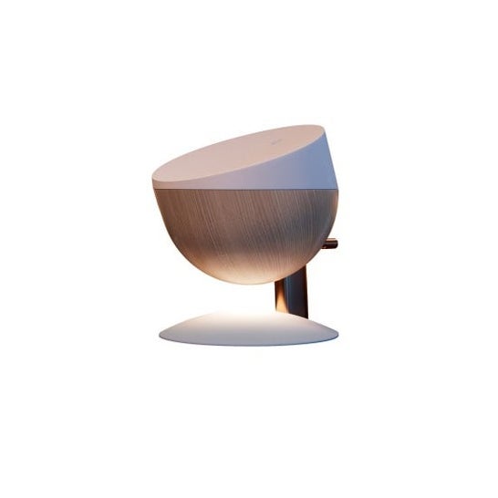 Ätherischer Öldiffusor mit dekorativem Design für die Beduftung aller Arten von Räumen. Es verfügt über eine LED-Beleuchtungsfunktion, die das Gefühl vermittelt, das Gerät würde in der Luft schweben. Er trägt dazu bei, eine entspannende Atmosphäre in jedem Zuhause oder am Arbeitsplatz zu schaffen. Er ist in Buchenholz mit weißen Details gehalten.