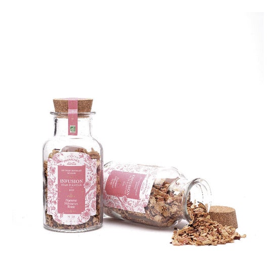 Biologischer Aufguss mit köstlichen, zarten und blumigen Noten von Apfel, Hibiskus und Rose für einen intensiven und beruhigenden Geschmack. Die Zutaten stammen aus biologischem Anbau. Es ist in einer eleganten Glasflasche verpackt.