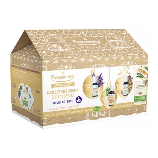 Puressentiel Aroma Expert Ritual Rétente Geschenkset ist ein Set ätherischer Öle, bestehend aus 10 ml Bio-Lavendelöl, 30 ml Bio-Mandelöl und 5 ml Bio-Majoranöl. Es enthält auch ein Buch über ätherische Öle, Pflanzenöle & Hydrolate, um ihre gesundheitlichen Vorteile sicher und effektiv zu nutzen. Geeignet für alle Hauttypen. Nicht geeignet für Kinder, schwangere oder stillende Frauen oder Personen mit Epilepsie.