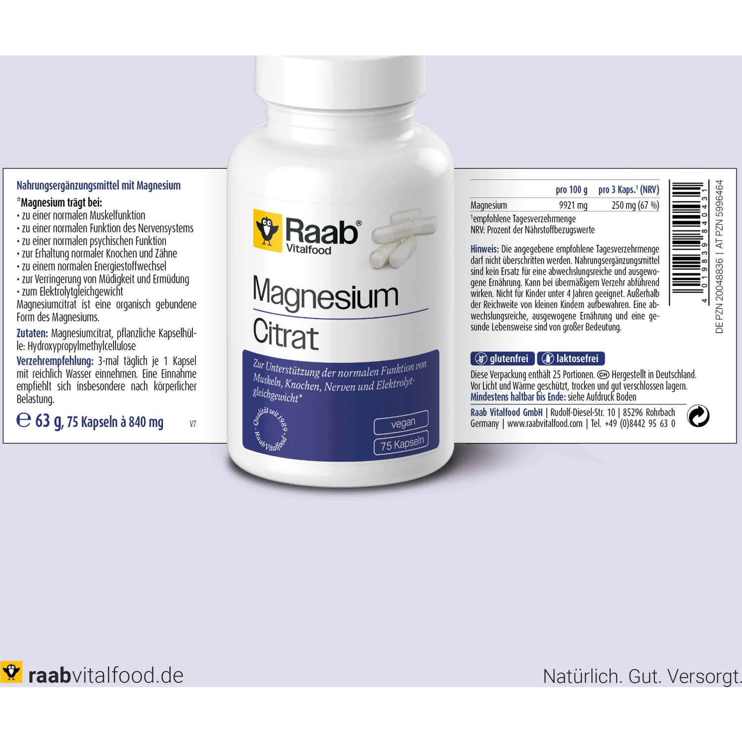 Nahrungsergänzungsmittel in Form von pflanzlichen Kapseln, hergestellt aus Magnesiumcitrat, das das Gleichgewicht des Elektrolythaushalts in den Körperflüssigkeiten fördert. Die Citratform wird am besten vom Körper aufgenommen und ist daher besser verwertbar als andere Formen.