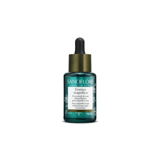 Sanoflore Essence Magnifica Bio 30ml ist ein trockenes Nachtöl, das reich an biologischen ätherischen Ölen ist und Mischhaut bis fettige Haut ausgleicht und reinigt. Die mit einem Komplex aus 9 ätherischen Ölen aus biologischem Anbau angereicherte Formel hilft, die Talgproduktion zu regulieren, Unreinheiten zu reduzieren und die Poren zu verkleinern, um das Hautbild zu verfeinern. Der Duft hat aromatische und zitrusartige Noten und ist 100% natürlich. Geeignet für Mischhaut bis fettige Haut. Dermatologisch getestet. Hergestellt in Frankreich.