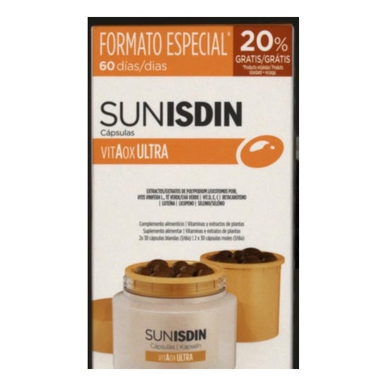 ISDIN SunISDIN 2x30caps ist ein Nahrungsergänzungsmittel, das hilft, der Photoalterung der Haut vorzubeugen und sie auf die Sonneneinstrahlung vorzubereiten.