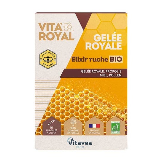 Vitavea Vita'Royal Gelee Royale Elixier aus Bio-Bienenstock 10 Ampullen ist ein Nahrungsergänzungsmittel, das entwickelt wurde, um die Abwehrkräfte zu stärken und den Körper auf natürliche Weise zu revitalisieren. Jede Ampulle enthält 1800 mg Bio-Gelee Royale, was sie besonders geeignet macht, um Energie zu liefern und das Immunsystem zu stärken. Sie ist ein wesentlicher Verbündeter in Zeiten von Jahreszeitenwechseln, Müdigkeit oder Genesung.