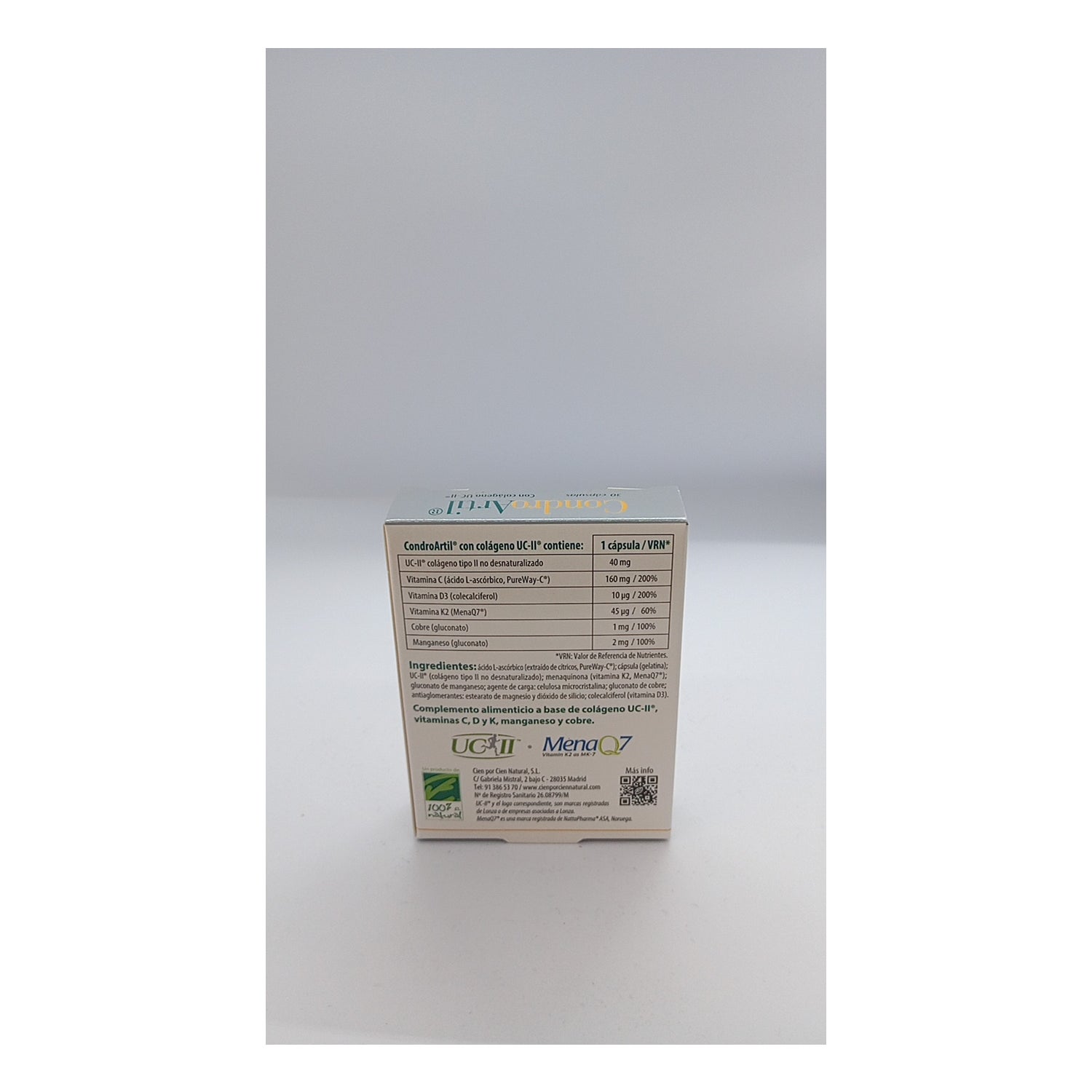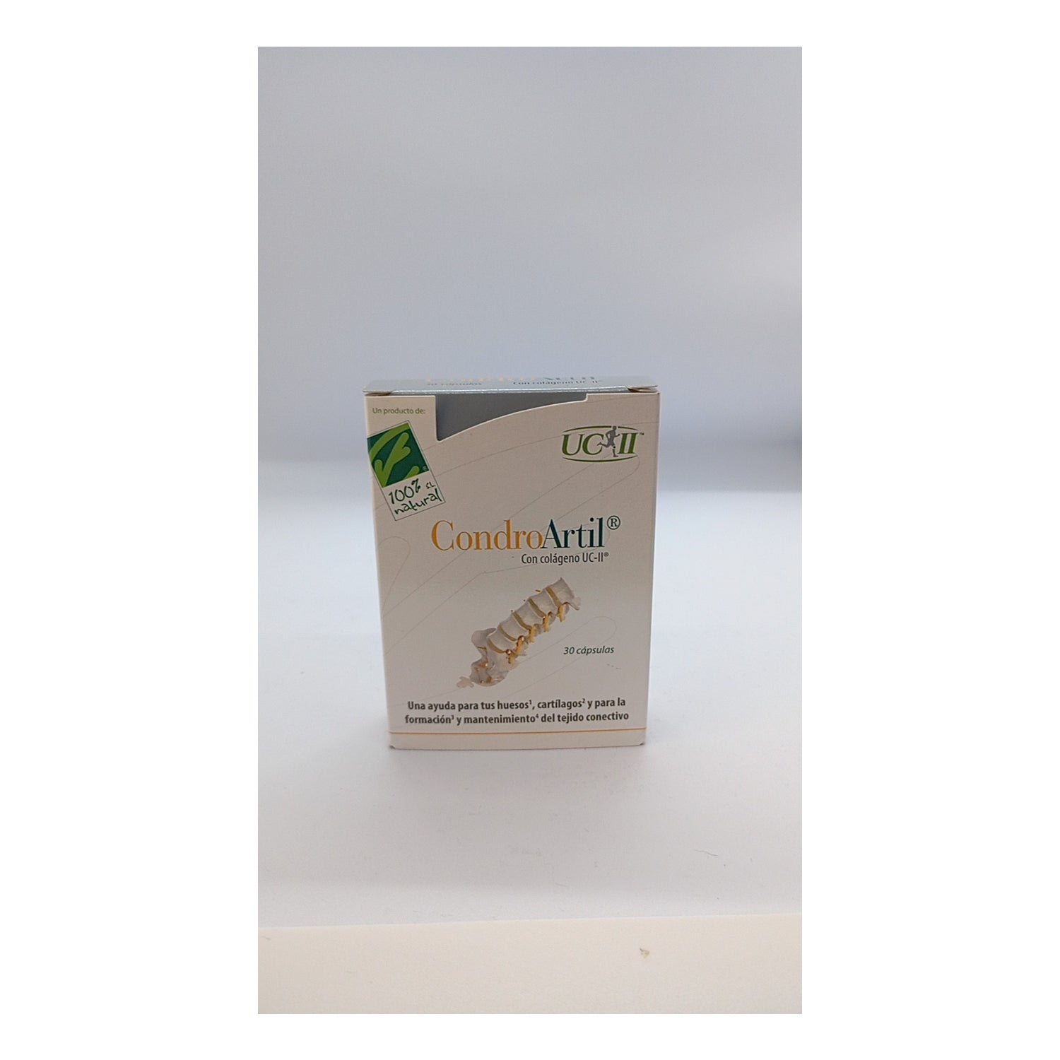 100% Natural ChondroArtil with collagen UC-II 30 capsules is a food supplement based on collagen UC-II® with vitamin C, vitamin D, copper and manganese, a combination of nutrients that help maintain bones and cartilage, in addition to maintaining good connective tissue conditions.