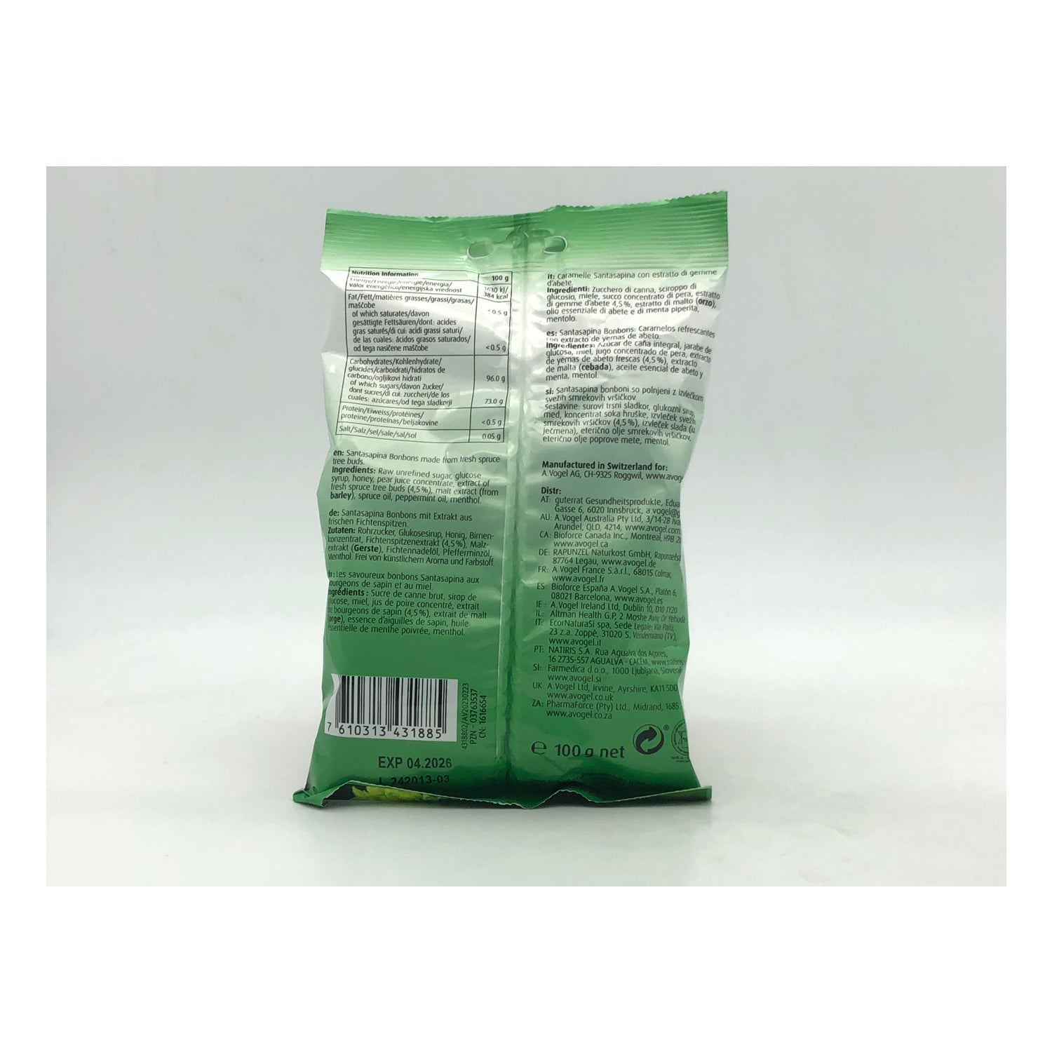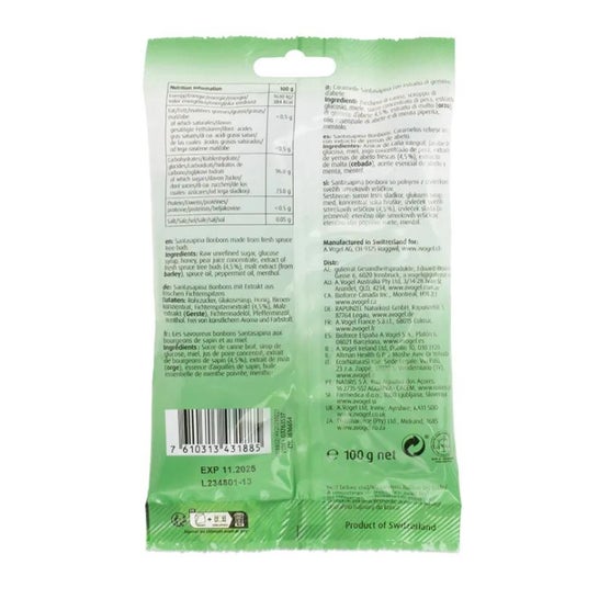 A. Vogel Santasapina Bonbons 100g are candies, enriched with juice and extract of fresh and wild grown spruce buds, indicated to reduce irritating coughs. They have a high refreshing power, to open the airways and allow you to breathe properly. They help to reduce throat clearing, hoarseness and cough immediately.