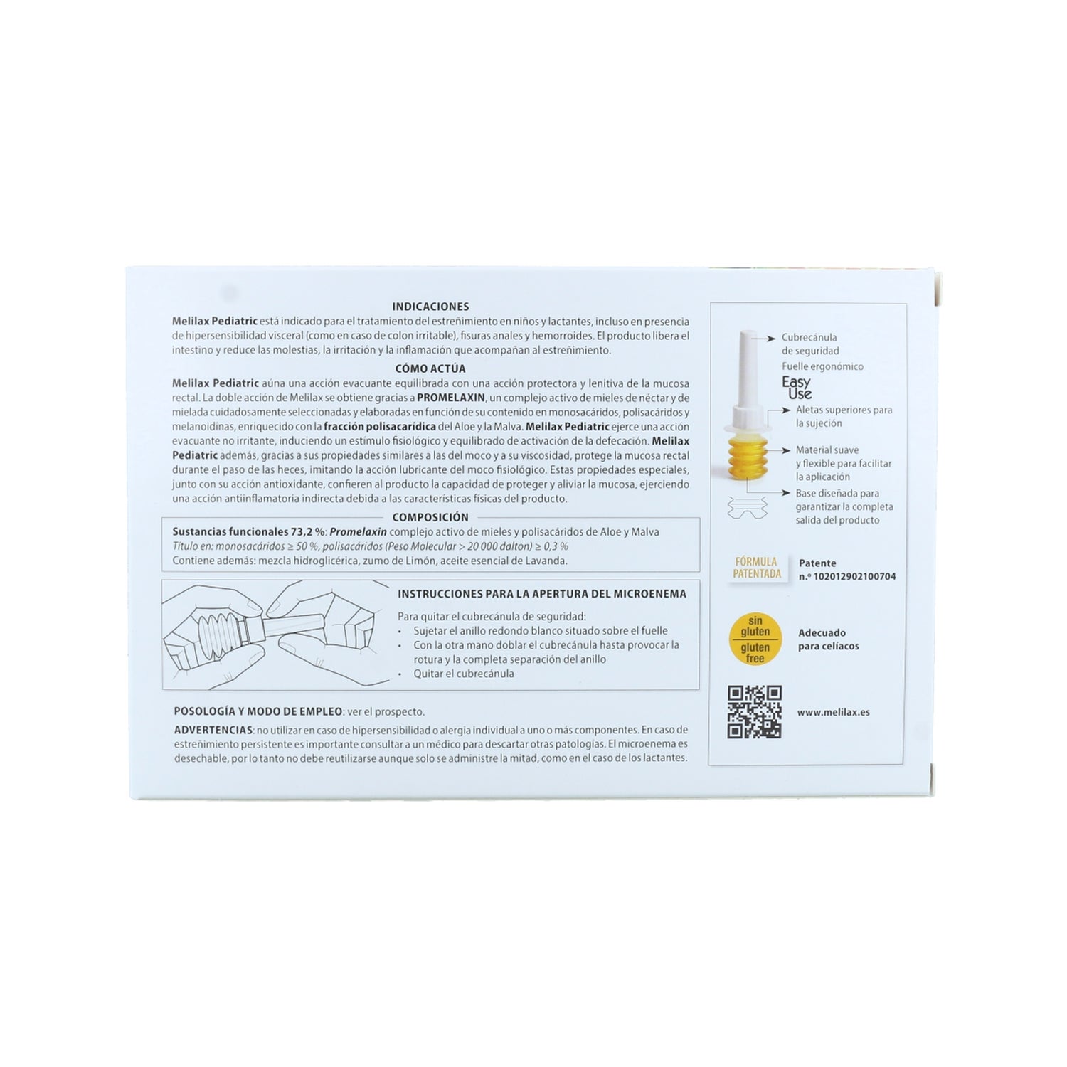 Aboca Melilax Pediatric 6uds is a microenema with promelaxin, an active complex of honeys and polysaccharides of aloe and mallow that promotes defecation.
