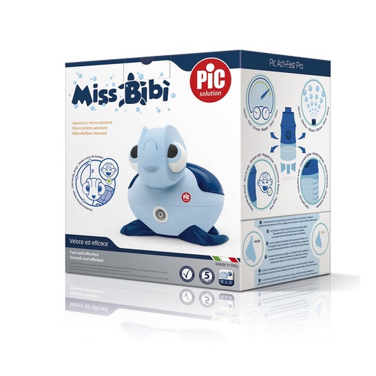 Pic Solution Miss Bibi Aerosol Piston 1 unit is a micro-piston aerosol for nebulization. Practical and silent, it has been specifically designed for little ones, shaped like a turtle, with compact dimensions that reduce noise and therapy duration, offering high performance. With a Pic Acti Fast Pro ampoule, it quickly nebulizes the drug, making aerosol therapy shorter and more effective. It includes: 1 adult mask, 1 child mask, 1 nasal fork, 1 mouthpiece, 1 tube, and 1 Pic Acti Fast Pro ampoule.