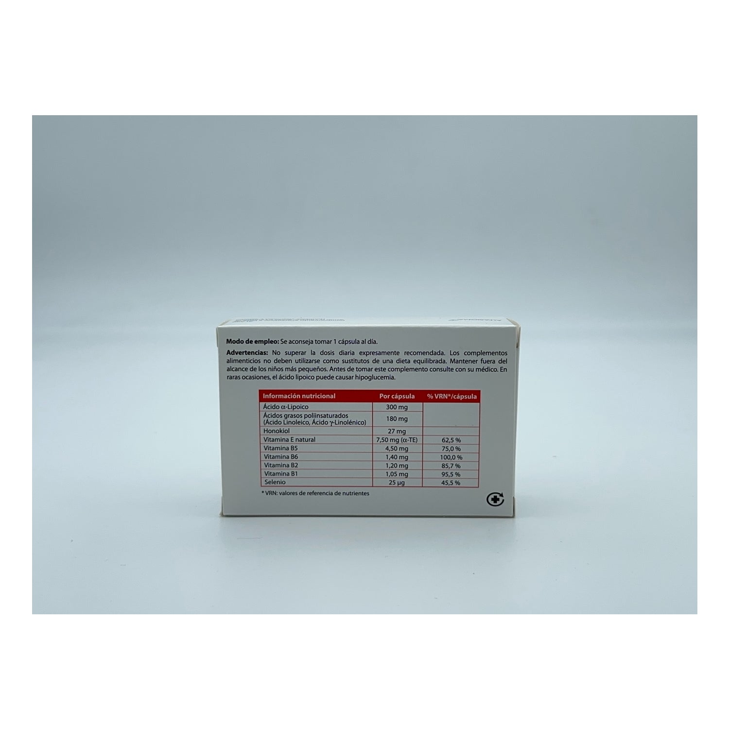 ALPHA-LIPOIC ACID; BORAGE OIL (FROM SEEDS OF BORAGO OFFICINALIS L.) TITRATED IN POLYUNSATURATED FATTY ACIDS; FOOD GELATINE; HARDENER: GLYCEROL; TRIGLYCERIDES OF FATTY ACIDS; MAGNOLIA E.S. (BARK OF MAGNOLIA OFFICINALIS REHDER & WILSON) TITRATED AT 90% IN HONOKIOL; EMULSIFIER: SOYA LECITHIN IN SOYA OIL; ANTIAGGREGATE: MAGNESIUM STEARATE; HUMECTANT: POLYGLYCEROL OLEATE; NATURAL VITAMIN E (D-ALPHA-TOCOPHEROL IN SUNFLOWER OIL); GROUP B VITAMIN COMPLEX VITAMIN B5 (D-CALCIUM PANTOTHENATE), VITAMIN B6 (PYRIDOXINE HYDROCHLORIDE), VITAMIN B2 (RIBOFLAVIN), VITAMIN B1 (THIAMINE MONONITRATE); COLOURING MATTERS: TITANIUM DIOXIDE, IRON OXIDE; SODIUM SELENITE.