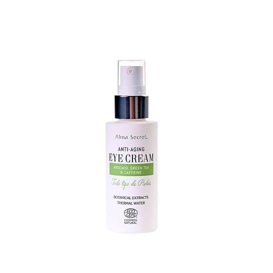 Alma Secret Contour anti-ageing eyes with avocado, green tea & caffeine 30ml treatment for the area of the eye contour with anti- ageing effect that improves the microcirculation of the area and treats small wrinkles of expression, bags and dark circles. Enriched with Hyaluronic acid, coenzyme Q10 and provitamin B5 imgredientes that strengthen the skin and provide optimal hydration.