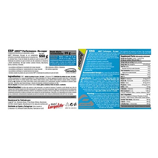 AMIX™ Performance Re-Cuper is a concentrated food supplement designed to be consumed after physical activity. Based on CFM® whey protein isolate and whey protein hydrolysate with high content of L-Glutamine and BCAAs (instant). Re-Cuper also contains Citrulline, Beta-Alanine, Glycine, vitamins and minerals.