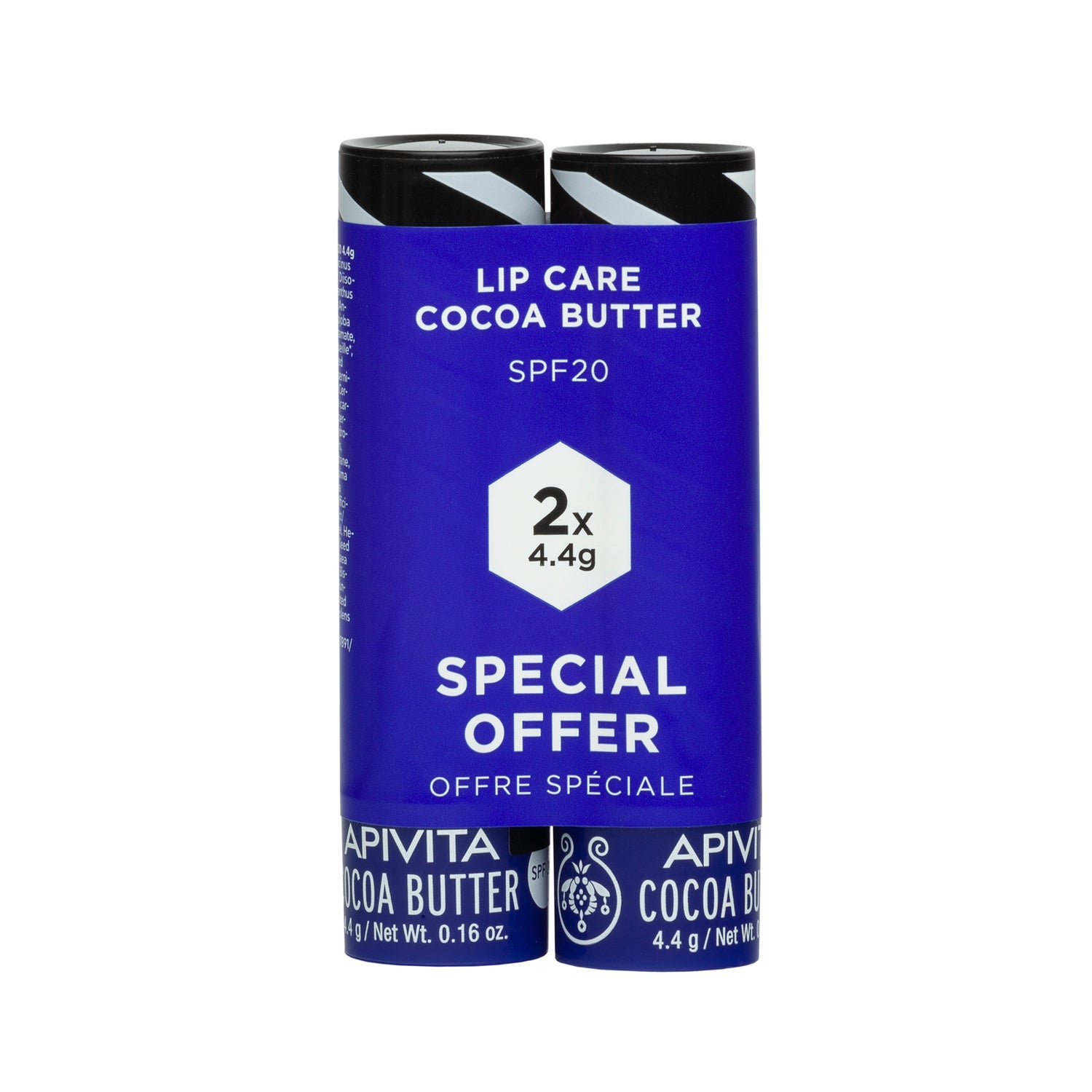 Apivita Double Cacao Blue Lip Balm 2x8.8g is a lip balm made with cocoa butter that offers a soothing and moisturizing effect. It helps relieve irritation and discomfort caused by dryness on the lips.
