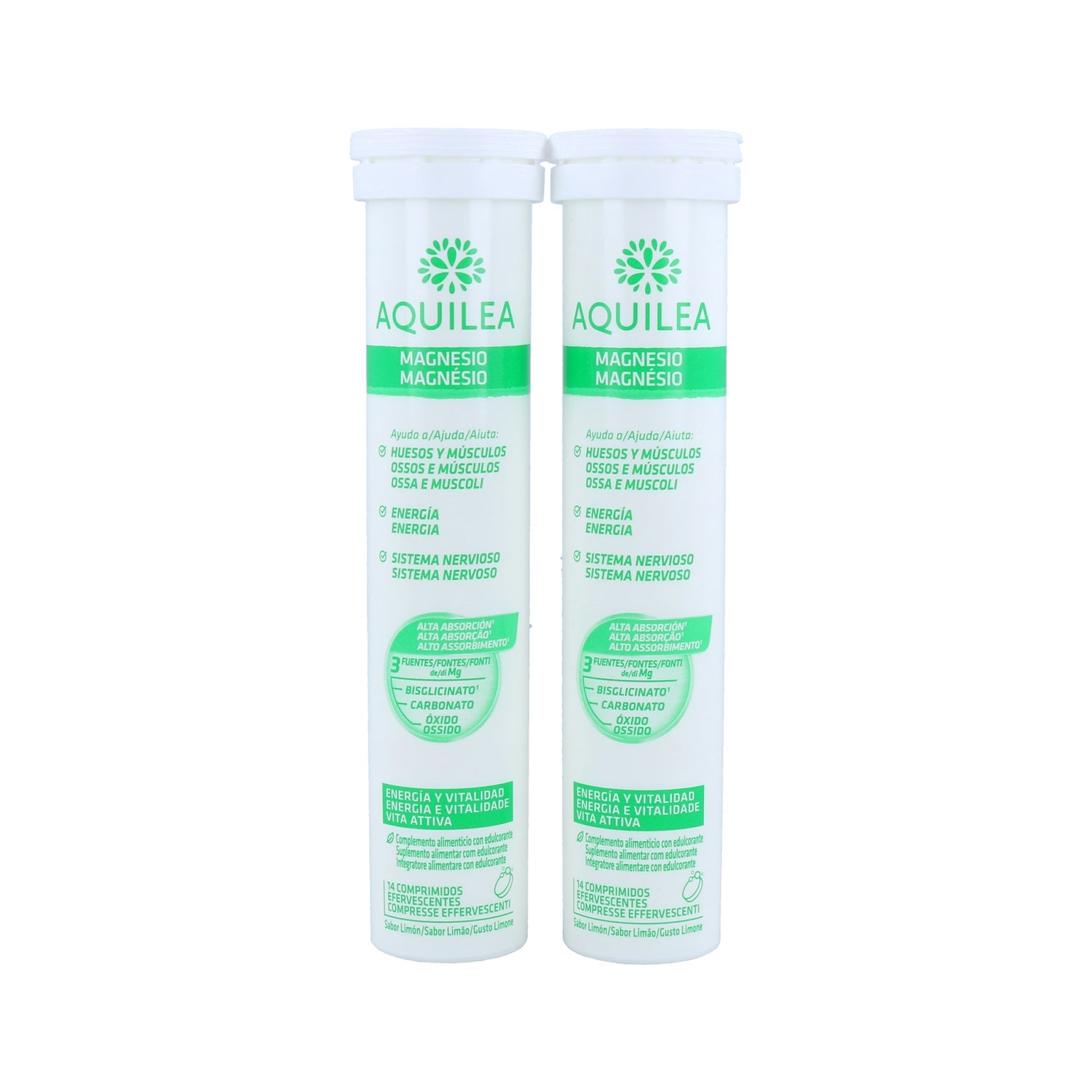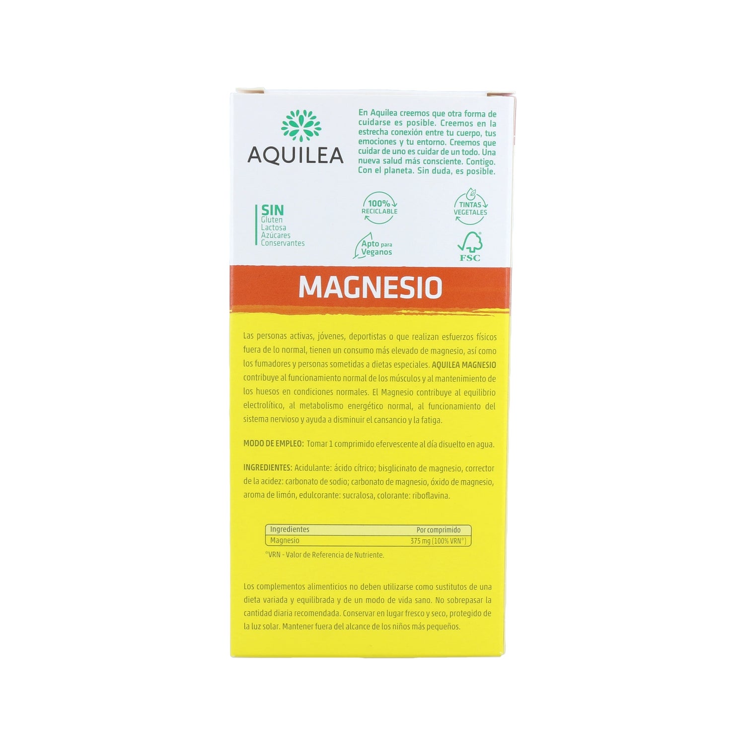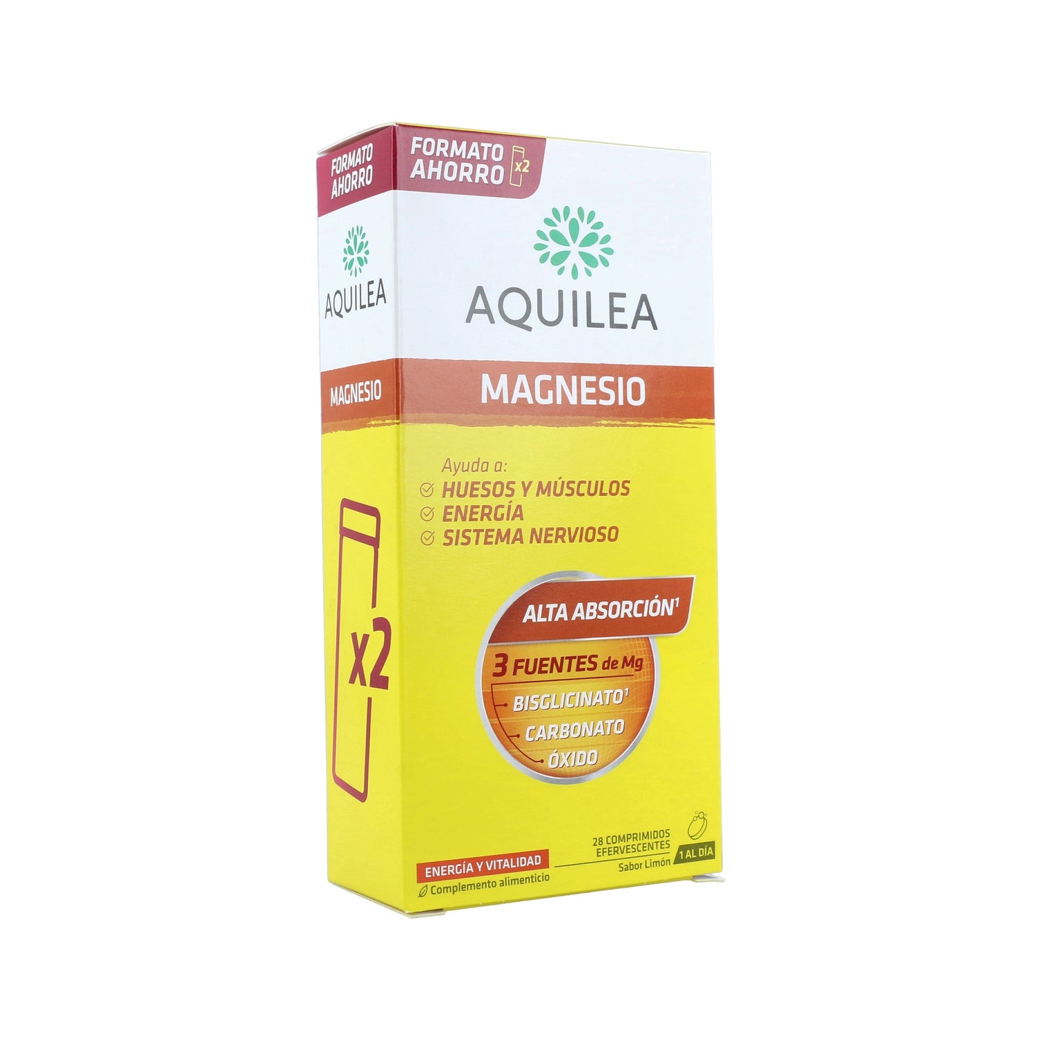 Magnesium dietary supplement, designed by Aquilea brand, presents effervescent tablets format with 28 units. Magnesium in effervescent tablets helps to naturally and effectively reduce tiredness and fatigue, as well as it contributes to electrolyte balance and normal functioning of muscles and bones. Improved formula that includes three sources of magnesium to achieve a high absorption of this mineral.