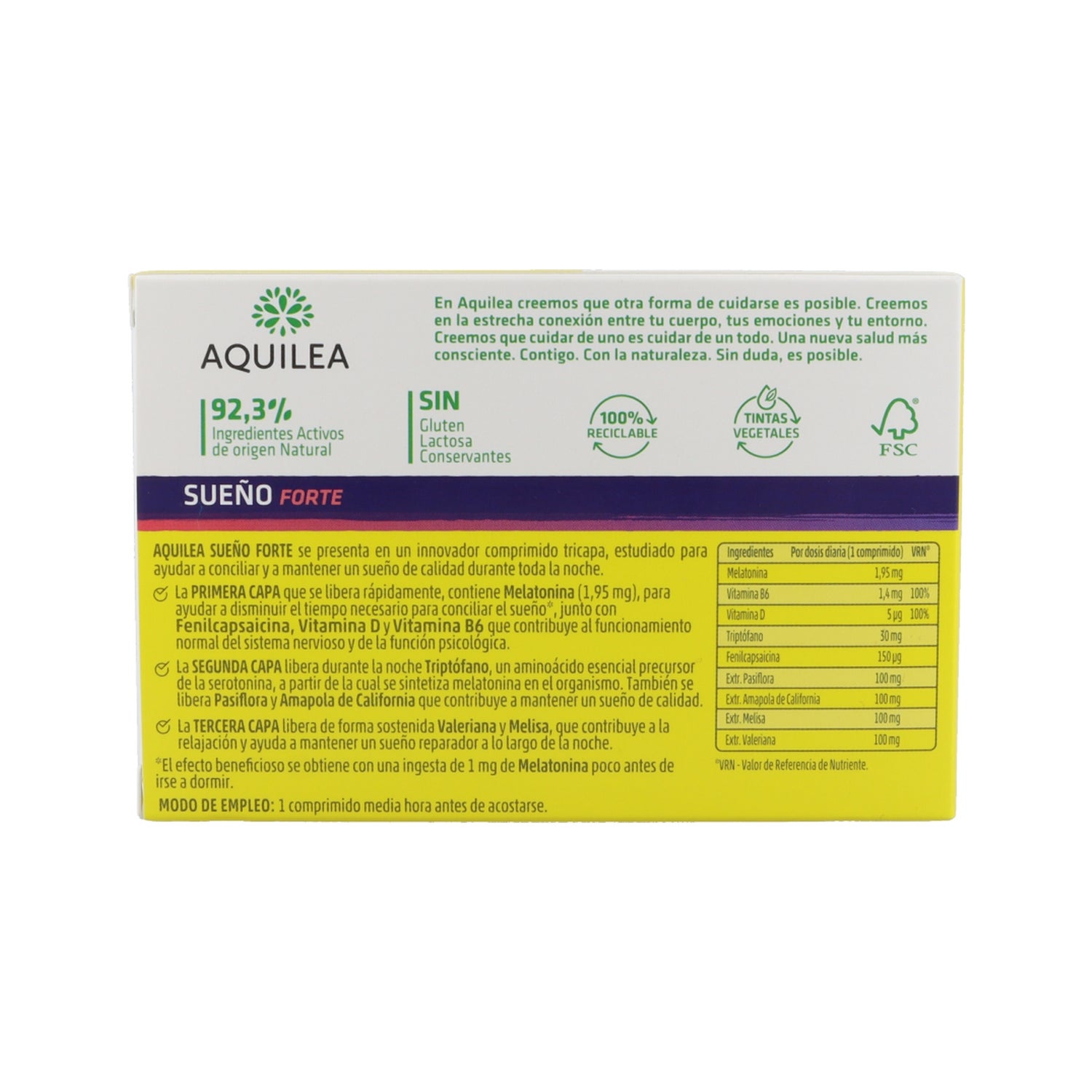 Its formulation is released in 3 phases, the first contains Melatonin, Piperine, Vitamin D and B6, and helps to reduce the time needed to fall asleep. The second layer contains Griffonia (5-HTP) which helps to synthesize Melatonin in the body. It also contains Passionflower and California Poppy which help to maintain relaxation and sleep. Finally, the third contains Valerian and Melissa, which are released in a sustained way to relax the body and contribute to a more restful sleep.