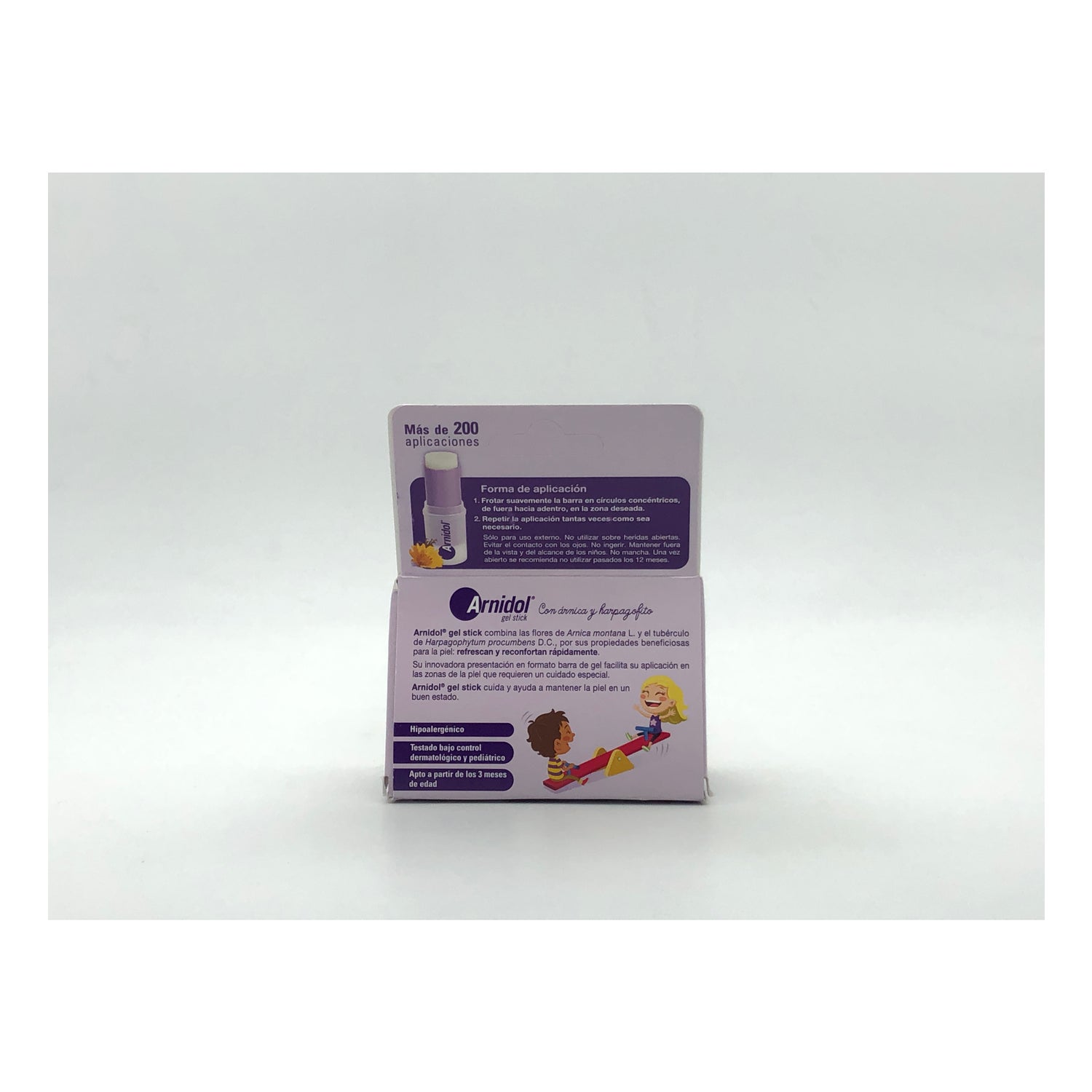 When children fall over or squabble, without suffering any open wounds, it is advisable to clean the area and rub it with Arnidol™ gel stick, making circular movements as necessary.