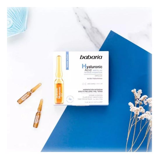 Babaria Hyaluronic Treatment 5un consists of Hyaluronic Acid facial ampoules of Babaria brand, in a pack of 5 units of 2ml each. These ampoules are recommended for all skin types, providing hydration to the face and generating a plumping effect that leaves the skin smooth. In addition, they help to blur small wrinkles or expression lines. They are suitable for both day and night application and have been dermatologically tested to ensure their efficacy and safety.