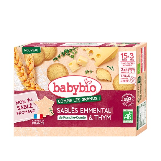 BabyBio Emmental Cookies from Franche Comté & Thyme is a delicious snack designed especially for little ones. These cookies, made with authentic cheese from Franche-Comté, are perfect for satisfying babies' small cravings. Their size fits perfectly in children's hands and mouths, and their combination of crunchy and melting texture is irresistible.